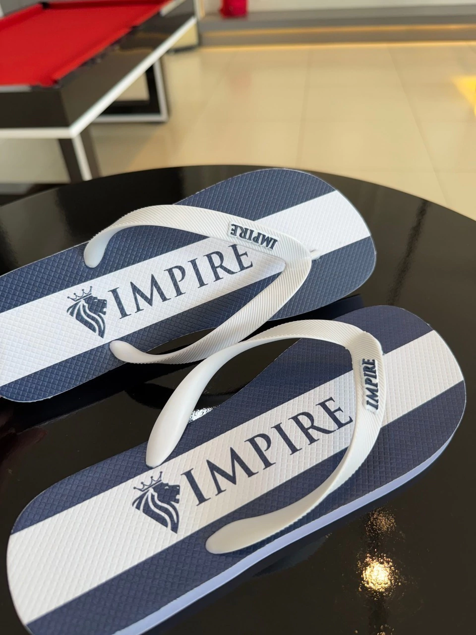 Confortável e estiloso, este chinelo branco apresenta faixa azul e assinatura Impire estampada, combinando modernidade e praticidade. Para locais informais e casuais, como passeios na praia, relaxar em casa ou momentos de lazer com a família e amigos.